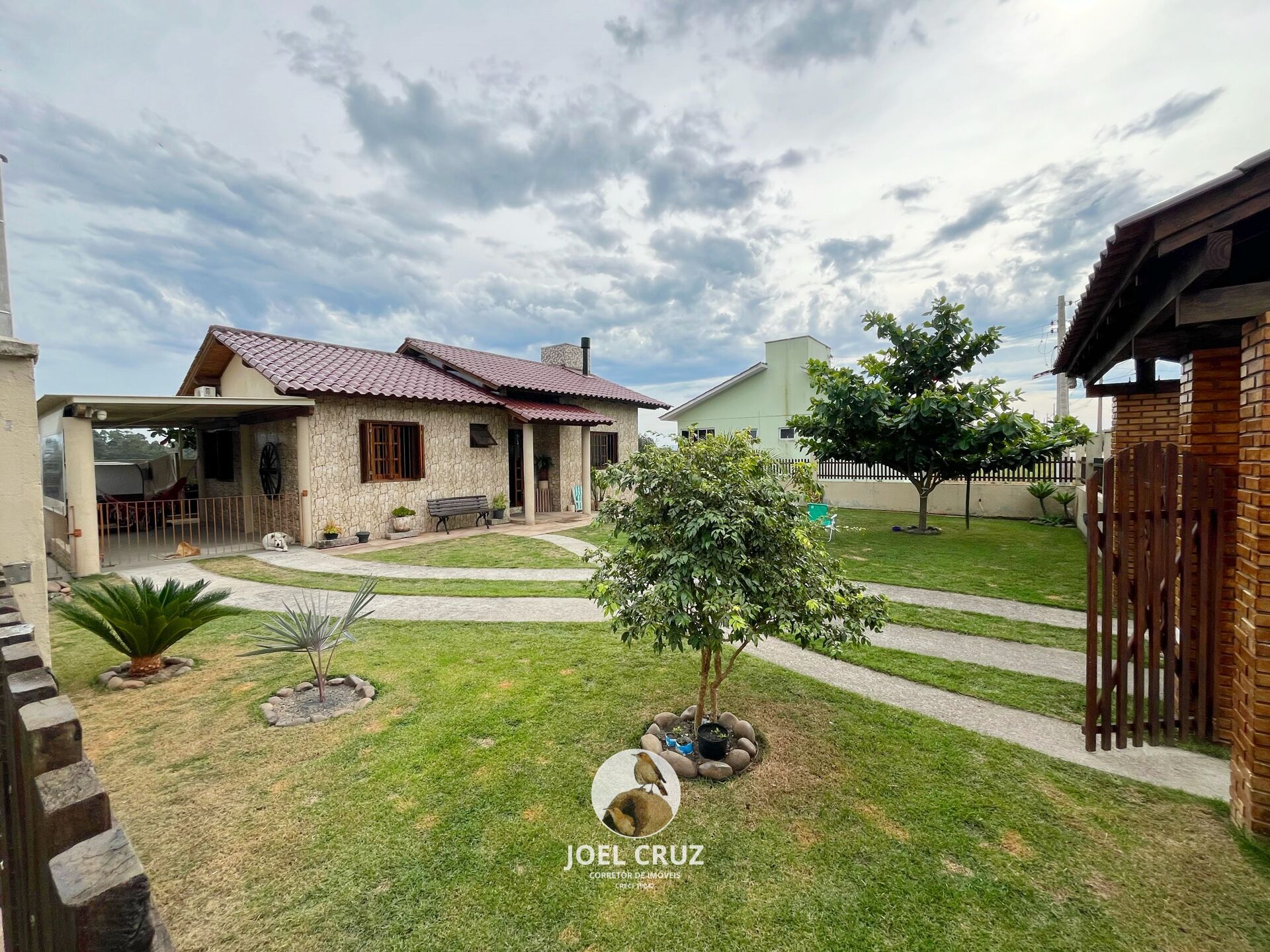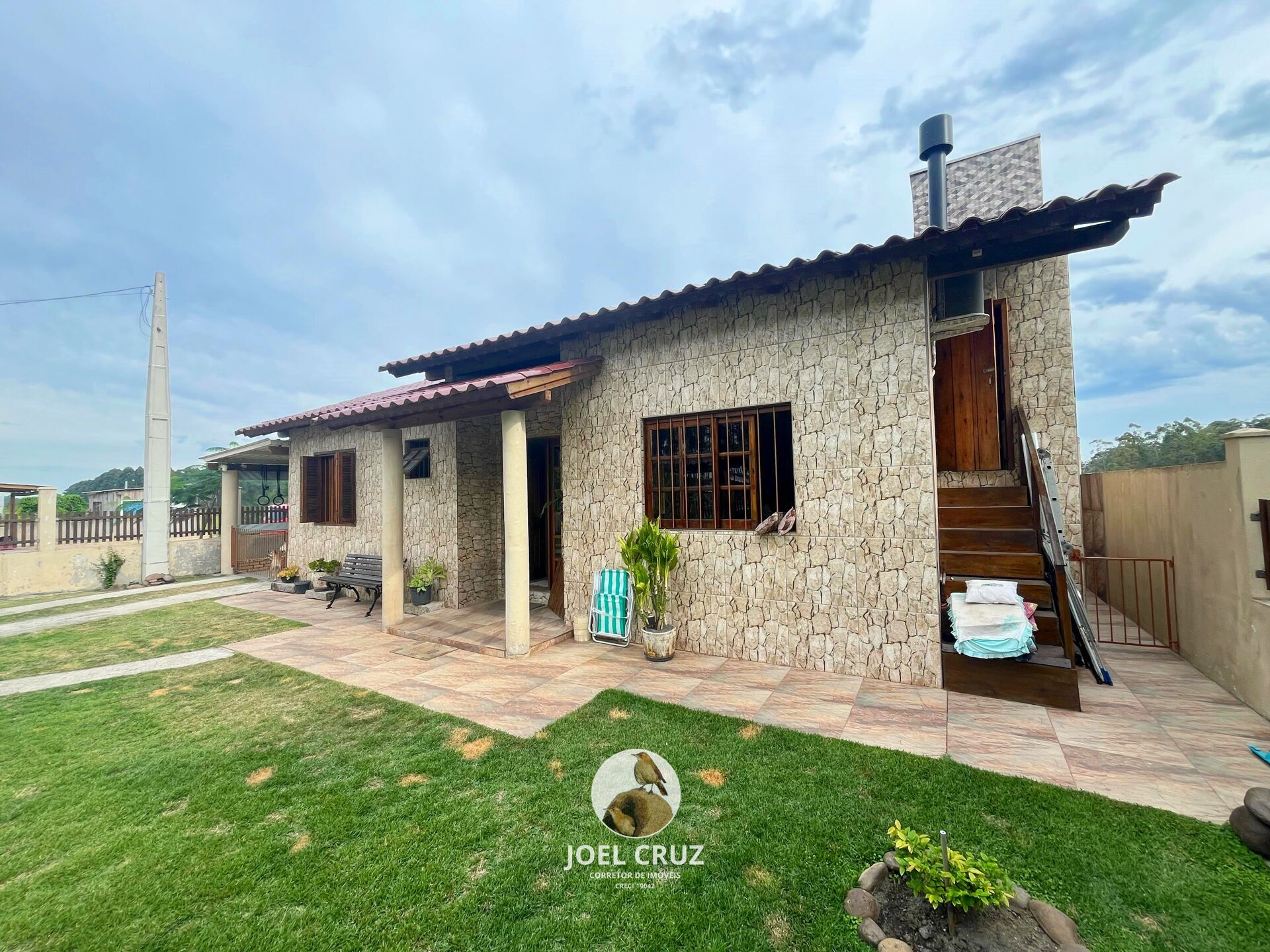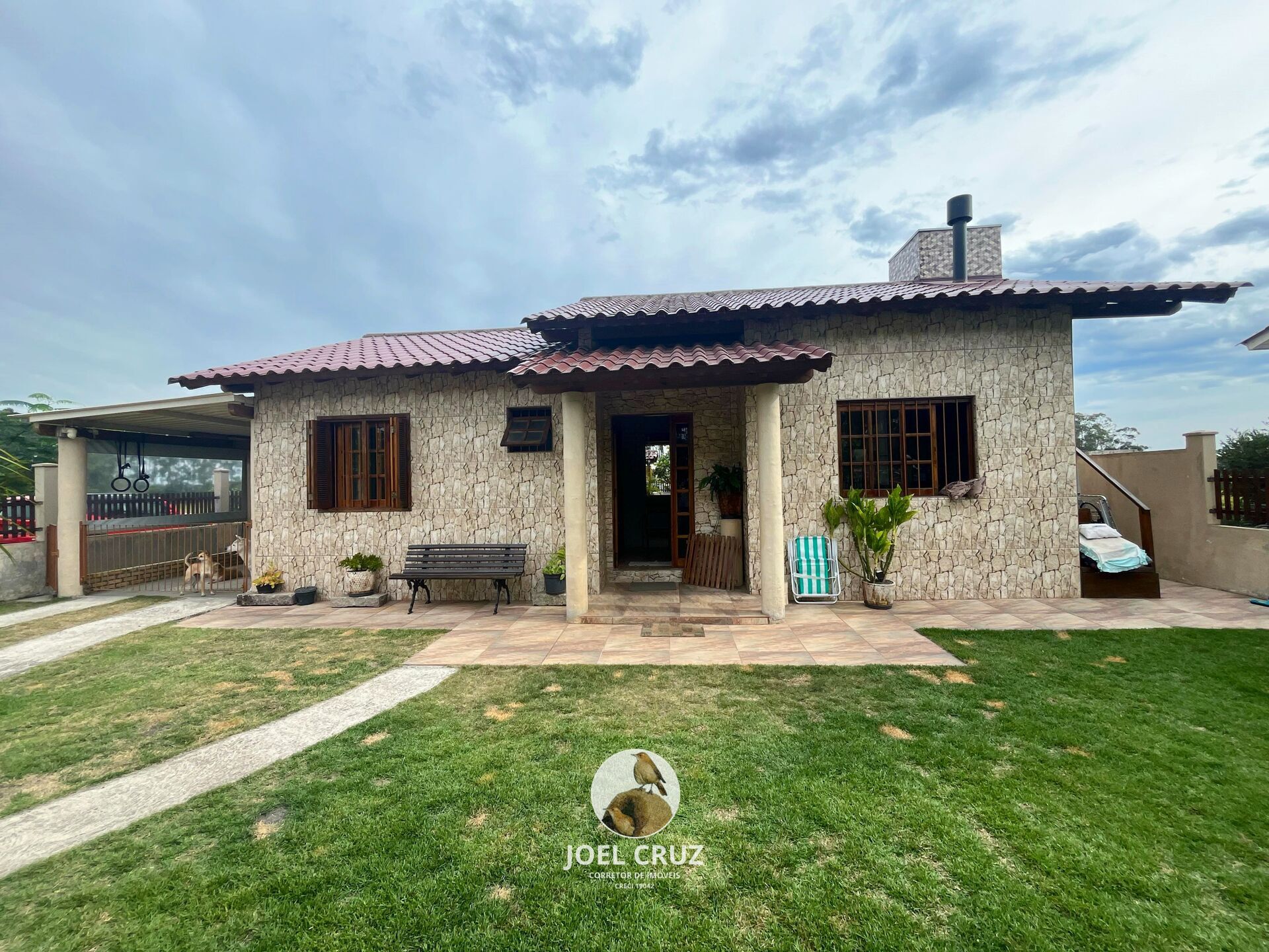 - 2 Quartos (sendo 1 mobiliado), sala (com lareira), cozinha, banheiro social , área de serviço, despensa, churrasqueira, garagem para 2 veículos e varanda,